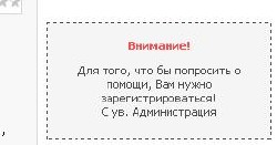 Скрипт красивая просилка регистрации для uCoz. Если юзер авторизовывается или входит под свом логином данное сообщение не выводится. Фон данного скрипта полупрозрачный, а это значит что скрипт впишется в любой дизайн сайта.. Установка: Заходим в нижнюю часть сайта и в самый низ прописываем: Код <?if($GROUP_ID$=='0')?><div class="reg-ball-cstav"><a href="$LOGIN_LINK$" title="cstav.ru"><b>Внимание!</b> Для того, что бы попросить о помощи, Вам нужно зарегист